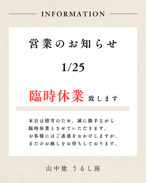 北陸地方は1月25日までの大雪が予想されており、積雪が多く除雪作業や通勤が困難な状態です。 たいへん申し訳ございませんが、うるし座は本日臨時休館させていただきます。